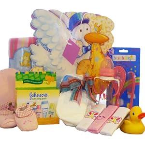 Product Description : Color: PinkLook what the stork brought! This paperboard gift bag tote delivers adorable surprises and handy baby necessities to celebrate the birth of the new bundle of joy. Themed in pastel pink for baby girls, Mom and Dad will appreciate the ultra soft fleece baby blanket, baby bottle, baby cap and booties set, a travel set of Johnson & Johnson bath products including baby powder, bath wash, baby shampoo and diaper ointment, a trio of diapers, set of 3 soft cotton washcloths, baby brush and comb set and of course, a rubber ducky for bath time fun! Each gift is hand crafted with attention to detail, tied with ribbon and includes a personalized gift card message from you to convey your best wishes. Manufactured by Art of Appreciation Gift Baskets.